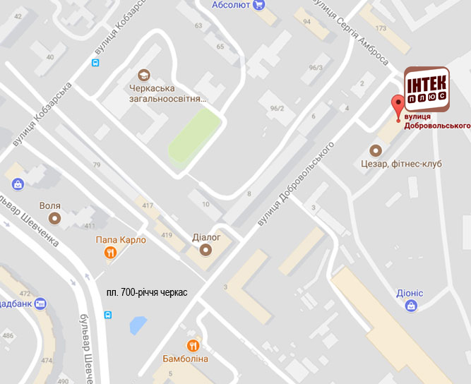 Черкаси, вул. Добровольського, 1, офіс 201 (пішки - 300 метрів від пл. 700-річчя Черкас, заїзд авто з вул. Сергія Амброса)